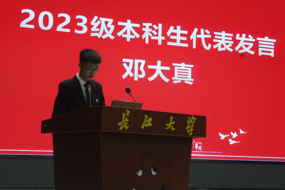 本科新生代表邓大真发言,表示将一步一个脚印向前走,刻苦学习医学知识,努力成为担当民族复兴大任的时代新人。