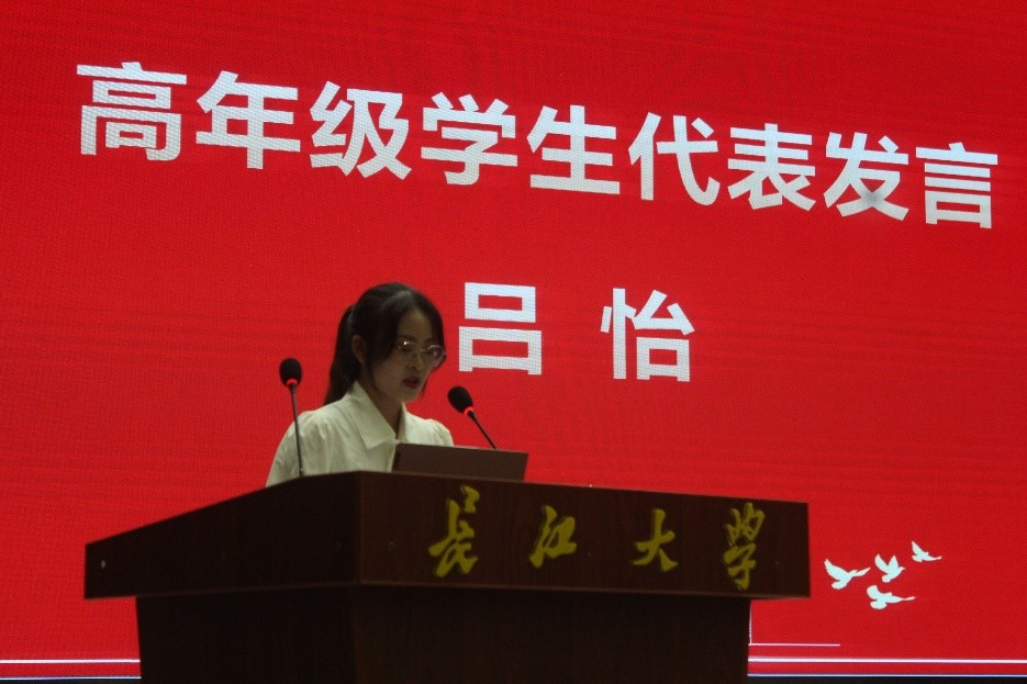 高年级学生代表吕怡发言,她分享了自己的学医经历,并为新生提出宝贵建议,勉励全体新生要做自觉律己、率先垂范、敢于担当的奋斗者,成为祖国未来医疗事业发展的栋梁之才。