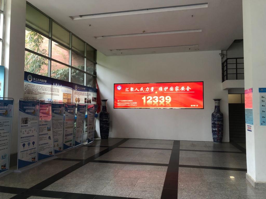 “国家安全,一切为了人民,一切依靠人民”“汇聚人民力量,维护国家安全”…… 国家安全及反恐、反邪教相关宣传标语清晰地显示在14号教学楼前的电子屏幕上,深深印刻进往来师生的心里。