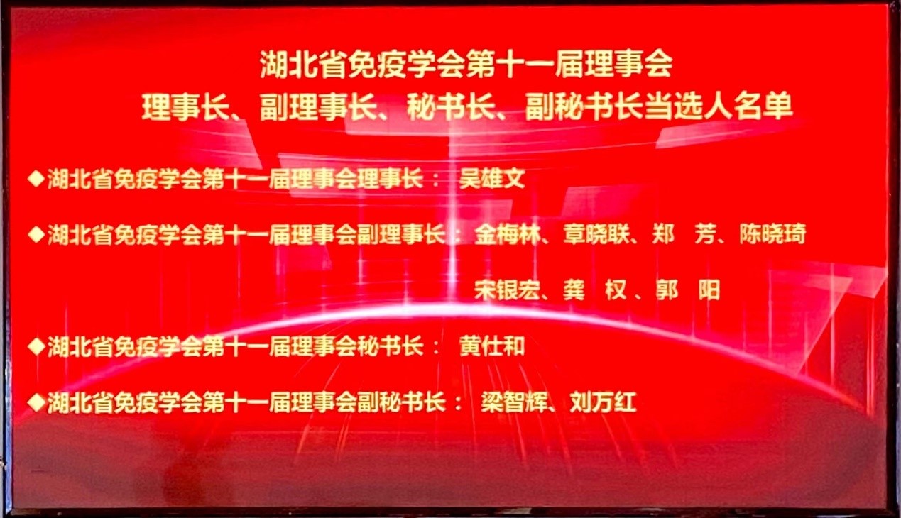 湖北省免疫学会成立于1986 年11 月,业务主管单位为湖北省科学技术协会,属于省级一级学会,挂靠单位为原同济医科大学,现华中科技大学同济医学院。本次大会共有来自华中科技大学同济医学院、武汉大学医学院、华中农业大学、武汉科技大学医学院、william威廉中文、三峡大学医学院、江汉大学、湖北文理学院、湖北医药学院、湖北民族大学医学院、武汉生物制品研究所,以及合作医院与企业等490多位代表参会。会议审议通过了上一届湖北省免疫学会的工作报告,选举产生了新一届湖北省免疫学会理事会,吴雄文当选为湖北省免疫学会第十一届理事会理事长,金梅林、章晓联、郑芳、陈晓琦、宋银宏、龚权、郭阳当选为副理事长,黄仕和为秘书长。