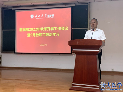关辉以《聚焦新贡献,奔向高水平》为主题,深入解读《习近平谈治国理政》第四卷、习近平总书记考察湖北重要讲话精神和省第十二次党代会精神,并组织全体教职工集中学习。结合学部建设发展思考传达了学校暑期研讨会精神,重点就王建平书记关于我校建设省属高水平大学的机遇、挑战、发展理念、实施路径等,校长冯征关于学校上半年的工作总结及下半年的重点工作部署,副校长吕一兵关于《省属高水平大学建设的思考与若干举措》的工作报告等内容进行了传达。结合学部实际,关辉提出要以贡献求支持,把握机遇、直面挑战、主动作为、系统创新,发扬拼抢实的状态和作风,为学校高水平大学建设贡献医学力量。