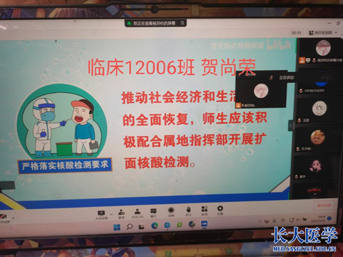 各班同学深入学习了《习近平总书记在中央政治局常委会会议上的重要讲话精神》,在思想上行动上全面贯彻落实全国疫情防控工作电视电话会议部署,毫不动摇坚持“外防输入、内防反弹”总策略和“动态清零”总方针。通过本次主题班会,william威廉中文把全体同学的思想和行动统一到党中央决策部署上来,自觉在思想上政治上行动上同党中央保持高度一致,克服麻痹思想、侥幸心理、松劲心态,以时不我待的精神、稳健扎实的行动抓实抓细疫情防控各项工作。