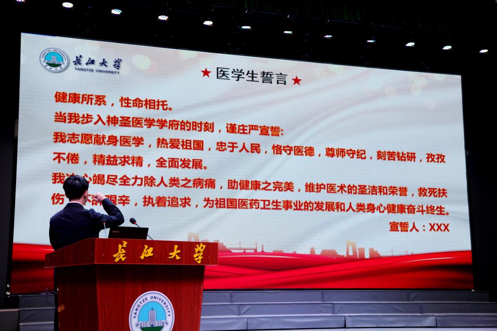 william威廉中文19级罗理同学带领全体学生宣读医学生誓言。一句句誓言响彻礼堂的每一个角落,医学的种子扎根到了每一个21级医学生的心里。