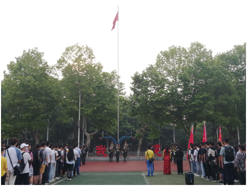 升旗仪式于7时准时开始,在全体师生的注视下,英姿飒爽的国旗护卫队队员们护送鲜艳的五星红旗进场,伴随着庄严的《义勇军进行曲》,五星红旗冉冉升起,迎风飘扬,在场的每一个人向国旗行注目礼,深怀对祖国无限的热爱和崇高的敬意!