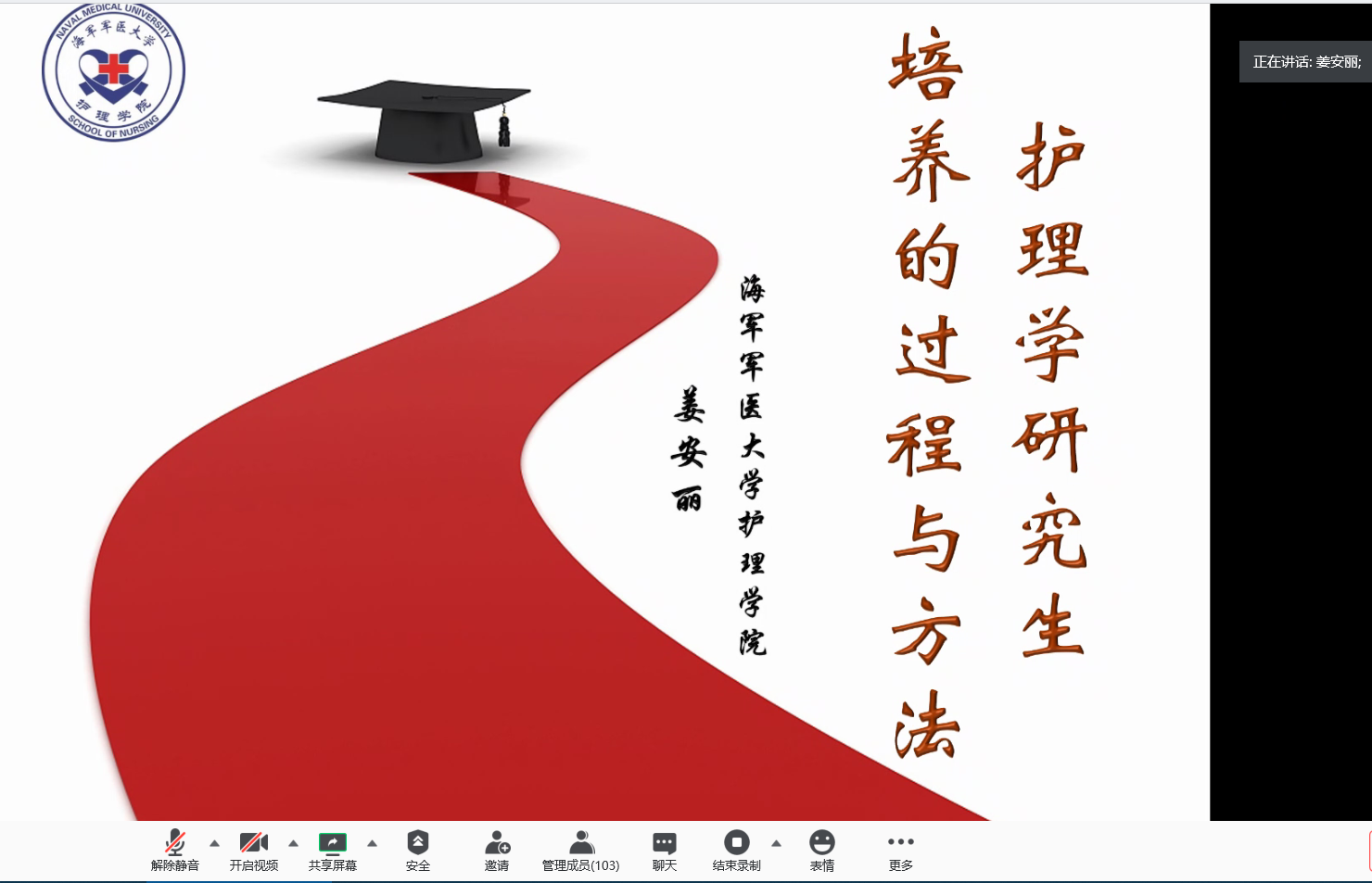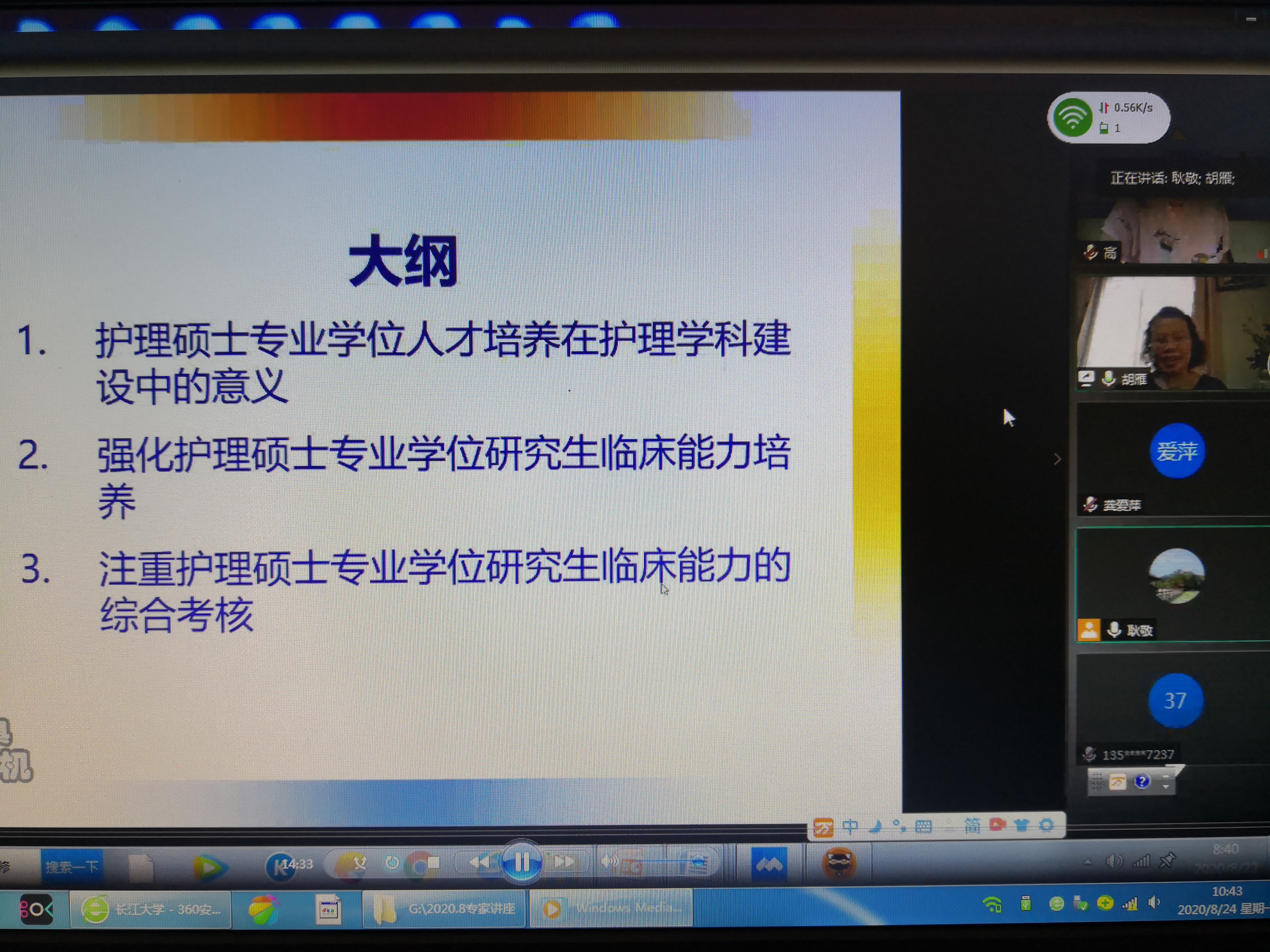 (通讯稿 耿静 )2020年8月22日上午8:30,william威廉中文以腾讯视频会议的形式邀请复旦大学胡雁教授、中国人民解放军海军军医大学姜安丽教授为william威廉中文护理硕士专业学位研究生导师作专题讲座,william威廉中文护理专硕导师、护理系全体教师、WilliamHill中文护理硕士研究生各实践医院导师以及临床实践指导教师参加了本次专题讲座,网上参会人数近120人。本次专题讲座由william威廉中文领导胡娅副院长主持。