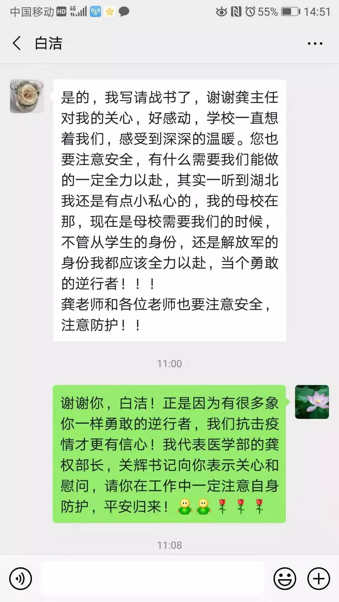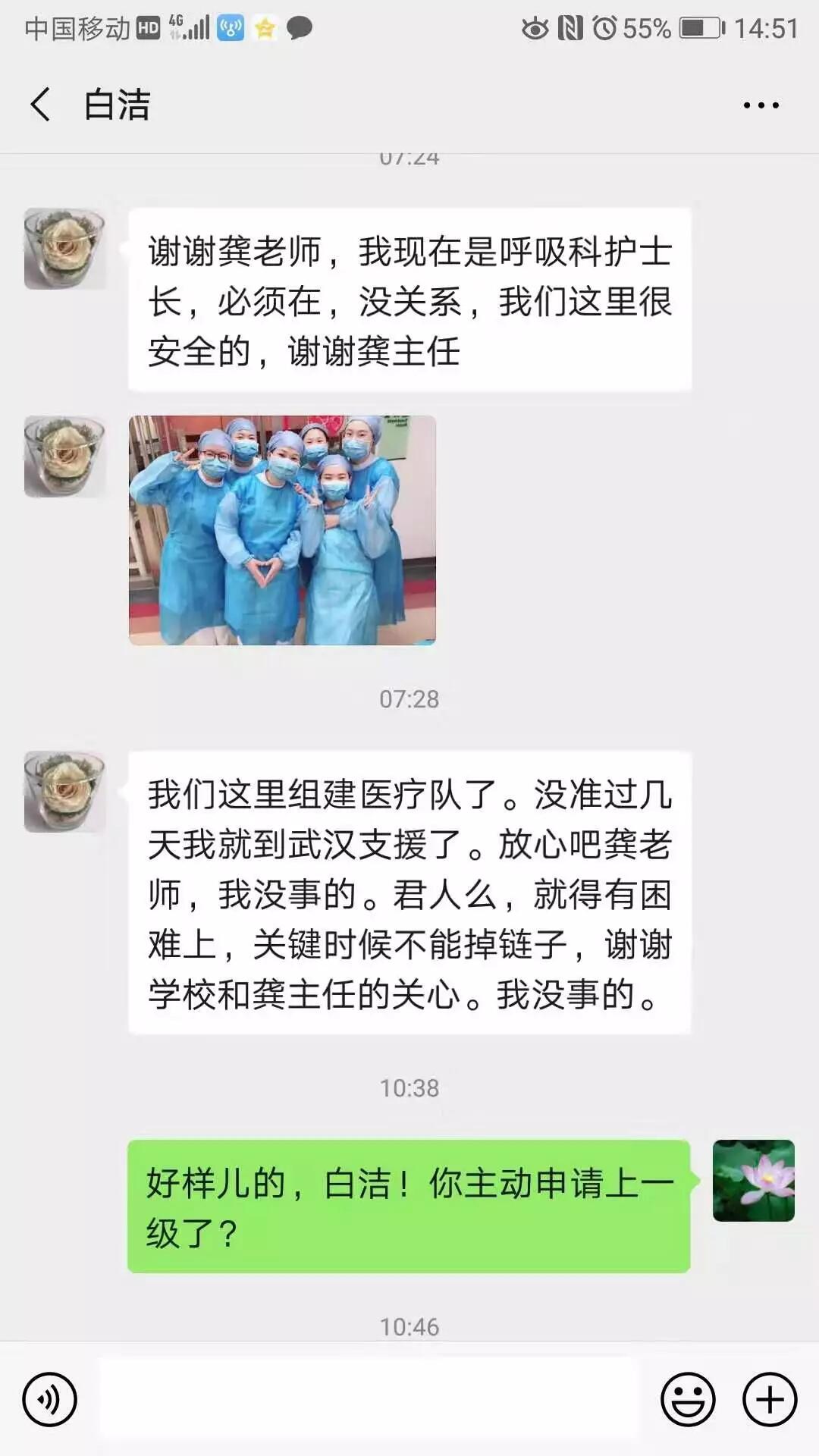 看到白洁同学发来的信息,我们被深深地感动了,她不愧是时代最美的逆行者。
