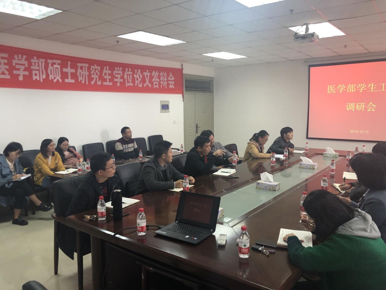 调研会伊始,关辉书记传达学校“不忘初心、牢记使命”主题教育精神,结合本学期学生工作实际,鼓励在场教师踊跃提出问题与困惑。会议交流环节,各班主任和辅导员提出了一系列实际问题,主要包括:学生医疗保销、贫困学生补助、晚自习签到障碍、学生自主学习能力、研究生住宿管理及考前压力等。围绕这些问题,与会人员进行了讨论。