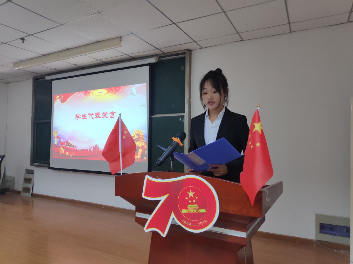 在主持人卢瑞琨的发言后,学生代表临床11902班李邦智发言,她回顾了中华人民共和国七十载的历程,半个世纪的发展和奋斗,为大家描绘了一幅波澜壮阔的画卷。之后活动嘉宾和同学们共同观看阅兵仪式,迎接祖国的70华诞!