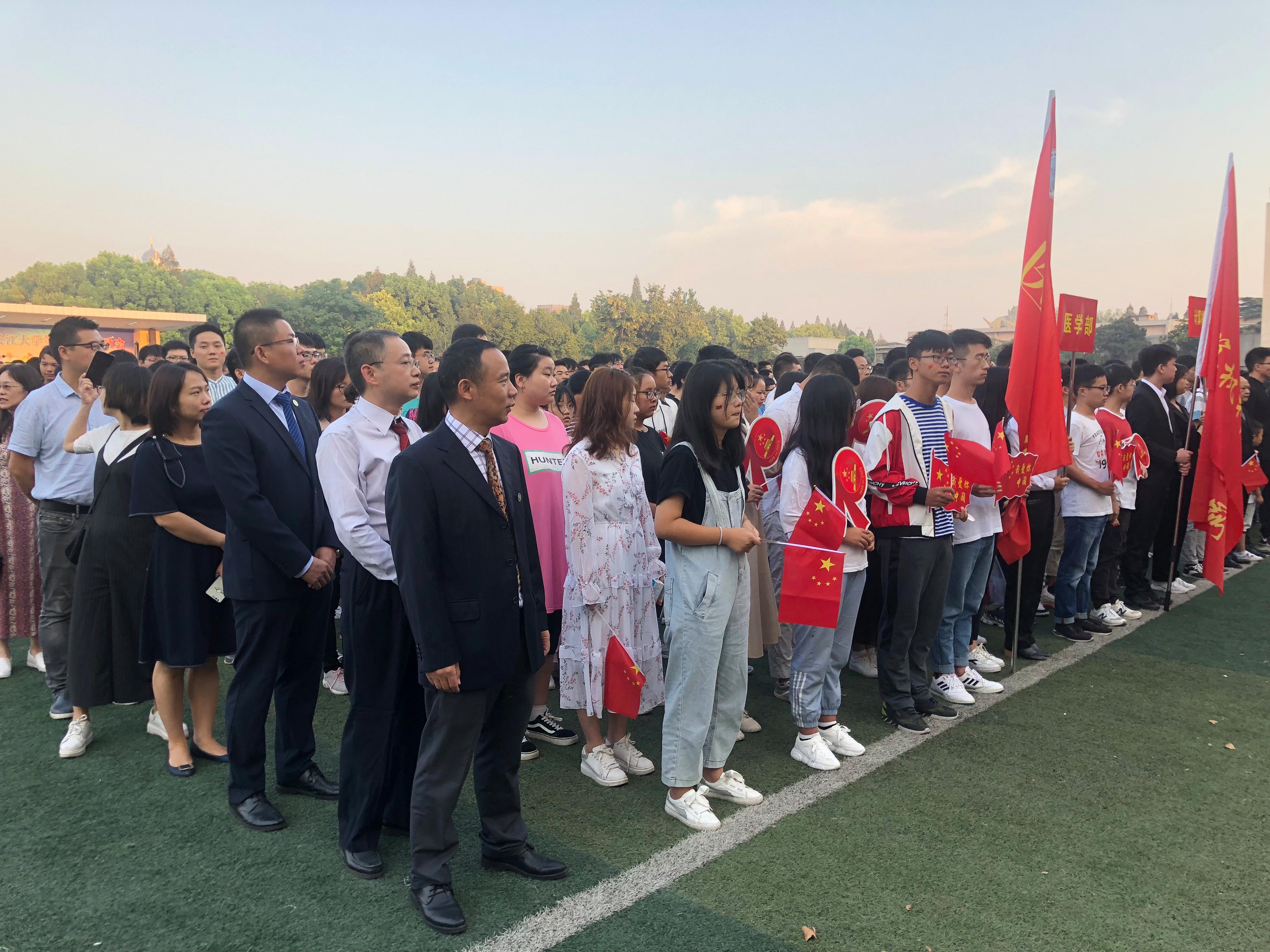 (通讯员:王乾 任柯婕、朱梦妮、潘俞彤、高宇彤)2019年10月1日早上七点,我校庆祝国庆70周年升国旗仪式分别在东、西、武汉三个校区隆重举行。william威廉中文常务副部长兼基础医学院院长龚权、党委书记关辉、健康医学院院长兼william威廉中文副部长黄江荣、基础医学院副院长胡娅、健康医学院副院长陈晓光、第一临床医学院党委副书记曾盼参加了升旗仪式。