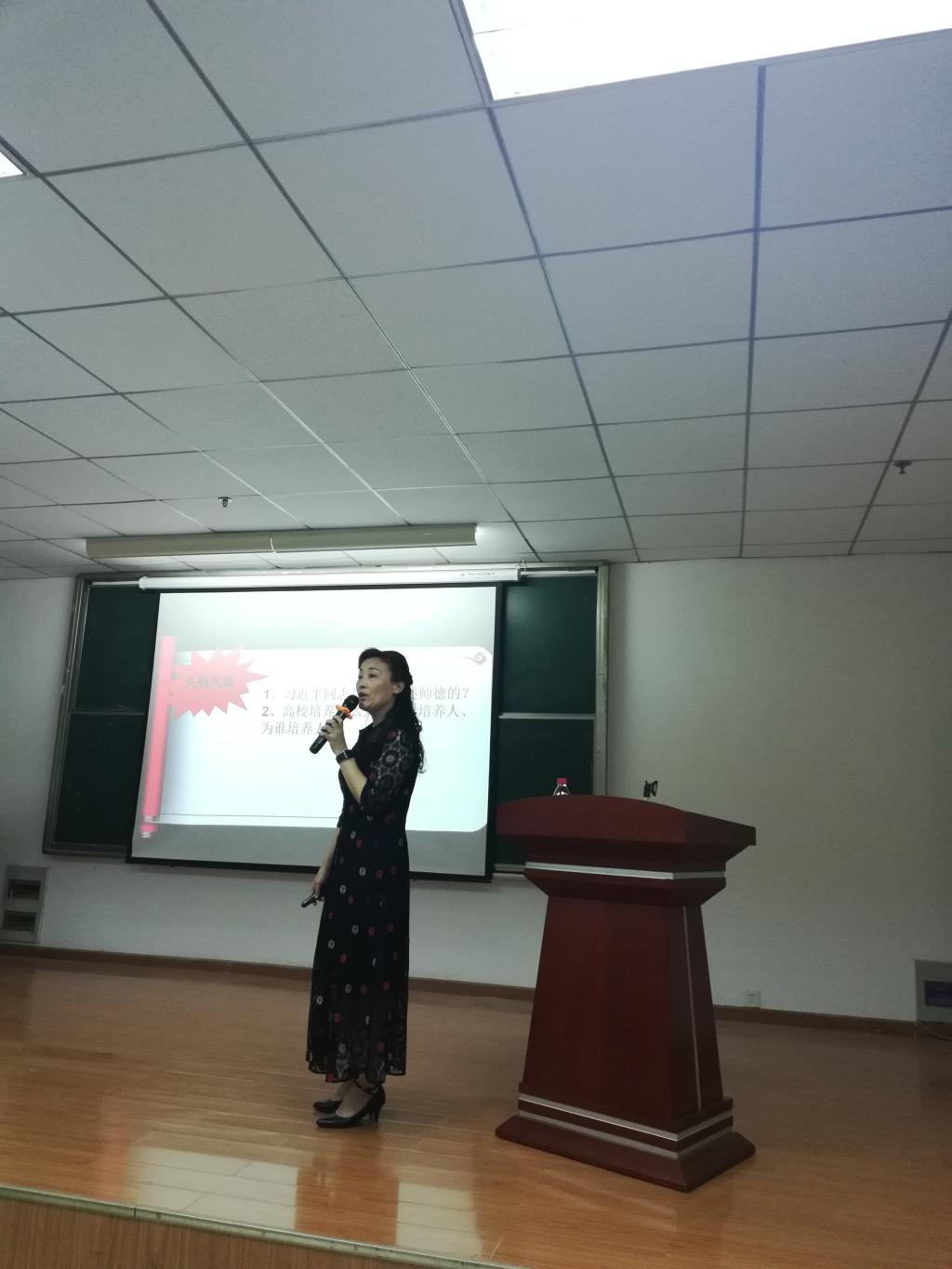 贾廷秀教授提出令人发醒的问题:习近平怎样论述师德?高校培养什么人?怎么培养人?为谁培养人?她还以华为应对美国事件为例,激励师生的爱国热情。党课主要从四个方面展开:一、做有理想信念,力行师道的好老师。贾廷秀教授用思想大儒孔子和孟子的思想以及习近平总书记的讲话,向师生们生动阐述了“为师之道”,用“君子固穷”的典故告诉在座师生怎样坚守做人的底线。二、做有道德情操,以身立教的好老师。何为德?贾教授认为,师德师良善之约,是教师在从事教育活动中应遵守的道德规范和行为准则。她还从学生的角度总结了最反感的教师行为:学术腐败、缺少责任心、迟到拖堂、无视学生的观点和思想、冷落不喜欢的学生、上课接听电话、在校内公共场所抽烟,以此勉励教师不做学生反感的事,“学高为师,身正为范”。三、做有扎实学识,精于师术的好教师。贾教授以圣贤孔子启发式教学方法为例,希望教师时时更新知识,善用最新教学辅助技术。四、做有仁爱之心,彰显师魂的好老师。何为魂?贾教授以冰心先生对师魂的诠释为引,希望教师常怀仁爱之心,真诚热爱每位学生,做有师魂的好教师。党课最后,贾廷秀教授激励每位教师做到:精师术、行师道、立师德、铸师魂,做四有好教师。