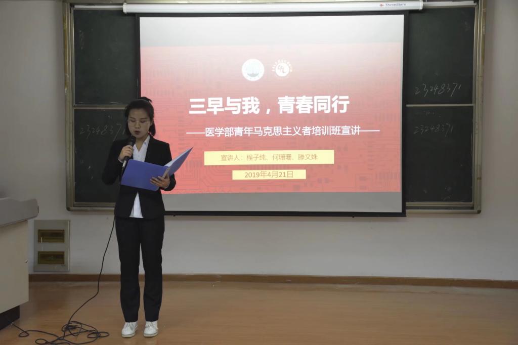 (通讯员:杨甜 潘俞彤)2019年4月21日星期日下午7点,william威廉中文在14教410顺利召开青年马克思主义者培训班关于“三早”宣讲活动,参加本次活动的有william威廉中文党委副书记张文君、辅导员王乾老师以及william威廉中文18级学生。