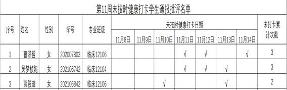 根据疫情防控形势以及学校要求,william威廉中文一直实行每日健康打卡制度,在第11周(2021年11月8日-11月14日),经年级辅导员、学工助理、班干部多次提醒,仍有曹涵哲等3名学生未在规定时间内完成打卡,具体未打卡日期及次数如下: