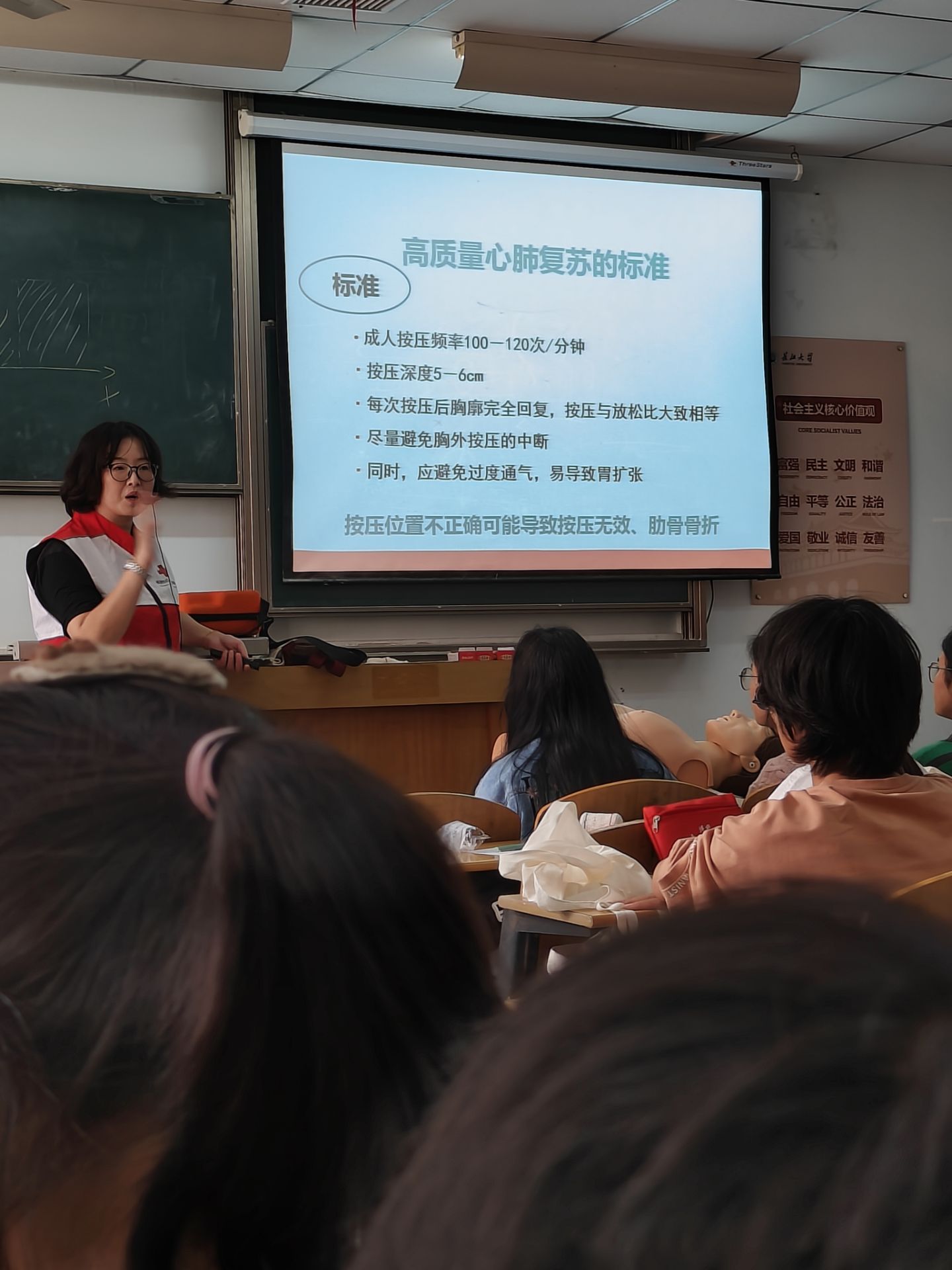 培训中,指导老师们用理论知识、案例导入和视频辅助相结合的方式,深入浅出地围绕日常突发意外、绷带的急救使用、赫姆洛克急救法、心肺复苏等基本技能等进行生动的讲解,并对急救操作过程中的注意事项进行重点强调。在实际操作环节,指导老师现场演示指导并和同学们开展深入的互动,指导他们进行现场演练,帮助他们在最短的时间内掌握基本的急救技巧。