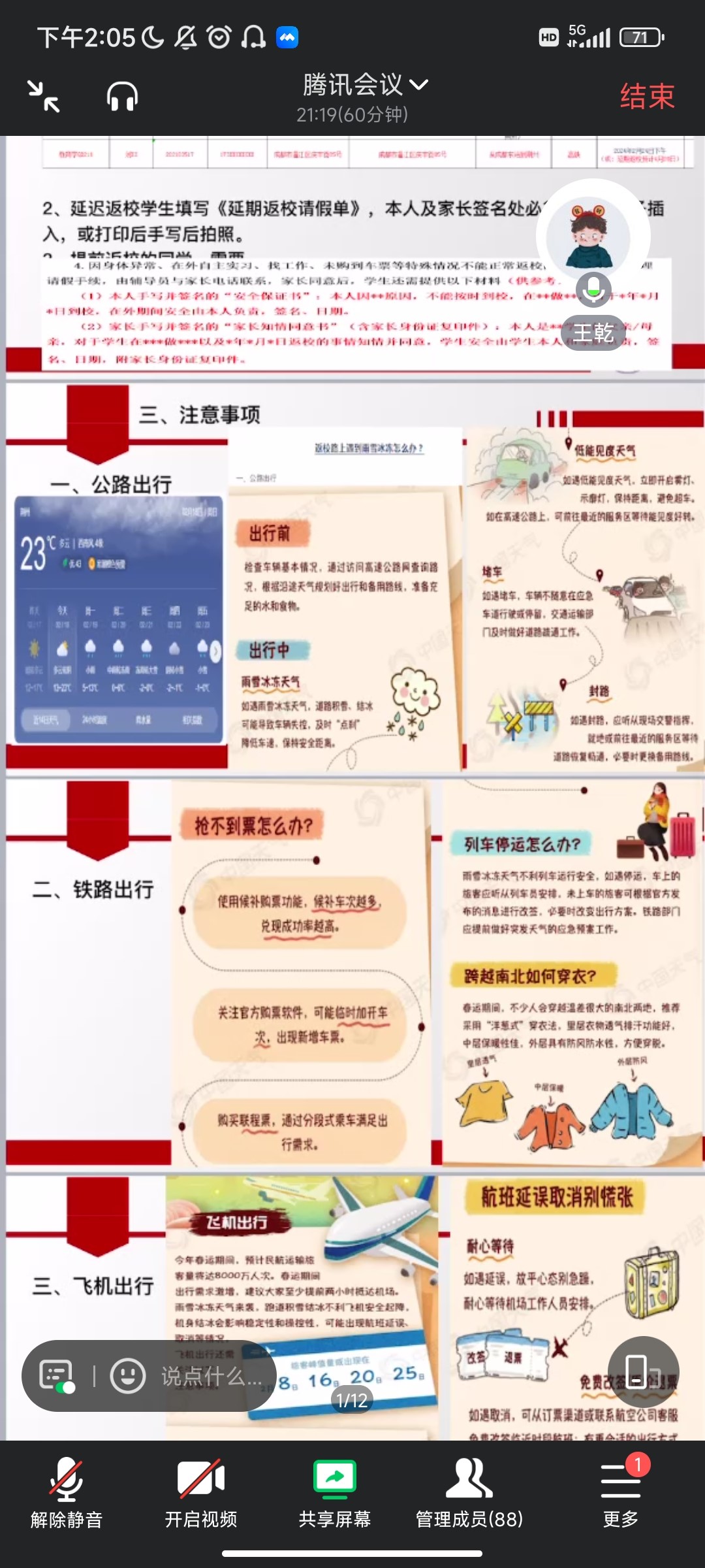 2月20日-22日,william威廉中文本科生、研究生各年级各班级通过腾讯会议召开了2024年春季开学前安全教育主题班会。班会上明确了学生返校具体时间,提醒同学们按时返校,因各种原因需提前返校学生,必须严格履行申请审批手续,做到先申请后返校、非批准不返校。班会中,各班还学习了交通安全专题教育材料,积极开展返校交通安全专题警示教育,并以校园内外发生的典型交通安全案例告知同学们交通安全事故的表现形式和处置方式。班会特别提醒同学们密切关注返程期间的天气变化和交通警示信息,妥善安排返校行程。返校期间做好人身和财产安全防护、提高反诈骗意识。如有异常情况需及时向学院申请延迟返校。返校后及时确认,并严格服从学校管理,确保学生返校工作安全高效有序。