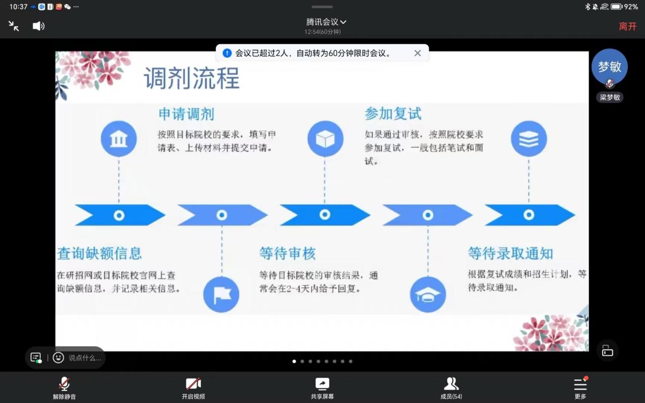 会议伊始,廖子锋老师动员学生认真准备研究生复试,并根据自身情况做好考研调剂和考公考编准备。朱子怡学姐就调剂流程及复试注意事项进行了分享,并重点强调调剂是场信息战,多关注研招网、意向学校研究生官网及学校微信公众号等方式及时获取调剂信息,甄别信息,避开热门学校和专业,调剂过程时间紧,学习任务重,建议报考中医基础、中西医基础、基础医学、生理学、免疫学等基础类冷门专业,会增加成功调剂的可能,并留下了联系方式以便随时解答同学们今后在复试和调剂过程中遇到的问题。
