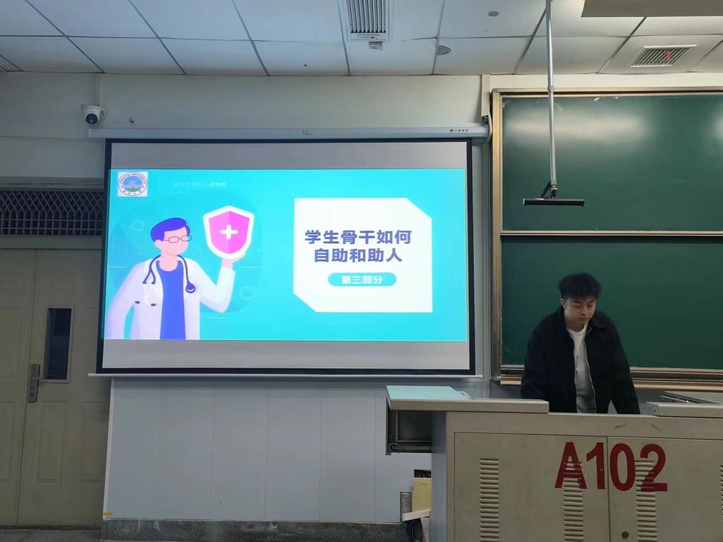 随后,廖老师告诉同学们作为学生骨干,要明白如何自助和助人。助人者,先自助。自助要做到自救和求救。学生骨干是学生中的排雷兵、传声员、倾听者和陪伴者。在危机干预中,学生骨干要做到睁大眼睛、伸出双手、张开嘴巴、留个心眼,学会及时转介、有条件的保密。千万不可打断别人、妄下结论、轻视问题。