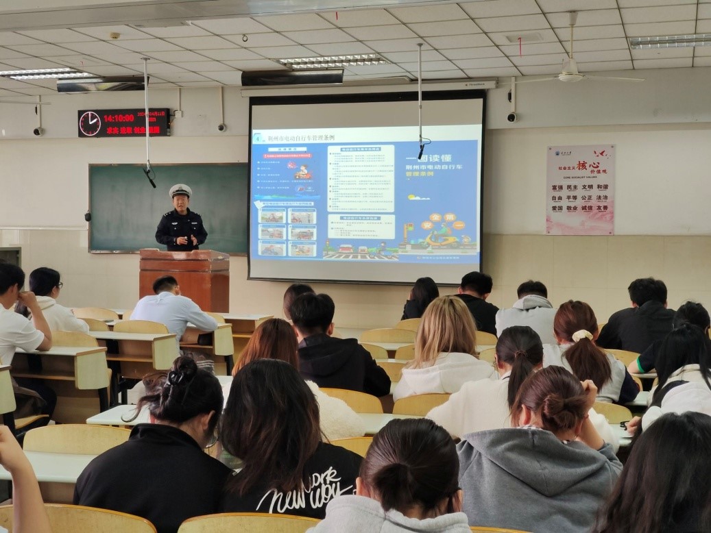 张警官为同学们送上了一堂生动的交通安全教育课。通过交通安全知识讲解、互动问答等方式向同学们讲解了交通安全法规,结合具体案例,讲解了交通法规中闯红灯、摩托车、电动车不带头盔等不遵守交通安全行为,对家庭和个人产生的不良后果,引导大家知法规、珍爱生命、安全出行。最后,张警官还对荆州市电动自行车管理条例以及荆州市智慧交通的建设情况进行了介绍。