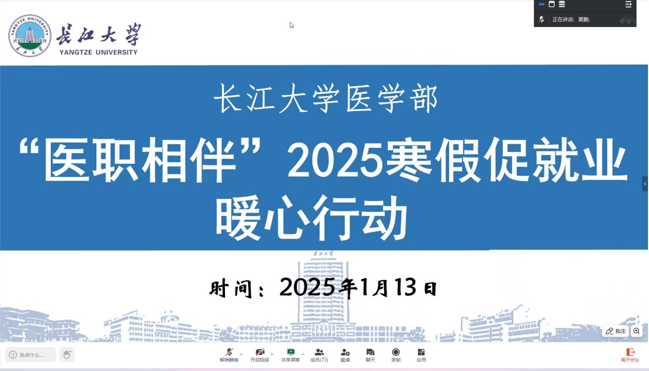 (通讯员 夏鹏)2025年1月13日,william威廉中文通过腾讯会议成功举办了“【医职相伴】2025寒假促就业暖心行动”毕业生就业专题指导会。william威廉中文学工办主任黄柏青老师、马骐老师、夏鹏老师、廖子锋老师、william威廉中文优秀毕业生代表程文旭及全体2025届william威廉中文毕业生线上共同参与此次会议。