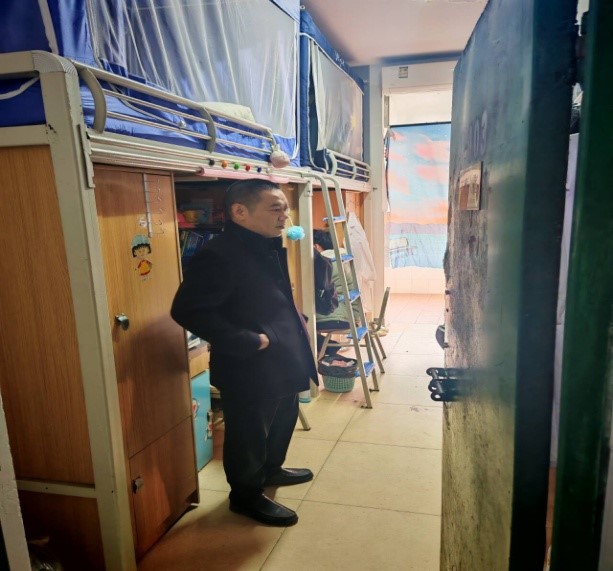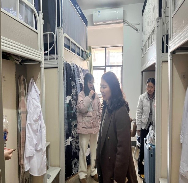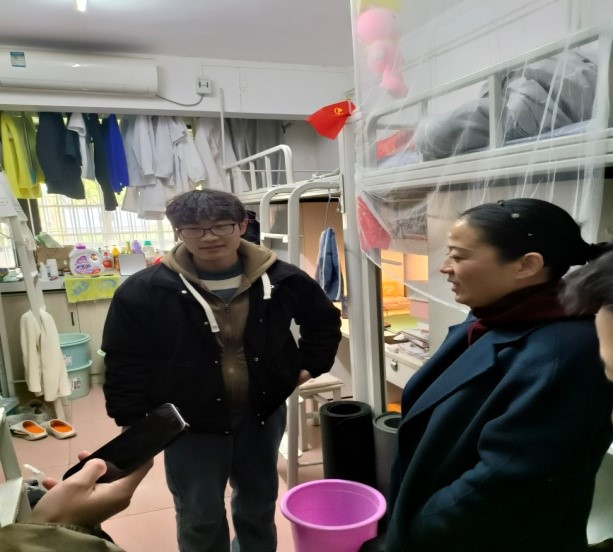 学部领导、班主任和辅导员们仔细查看寝室卫生,检查生活设施配备情况,同时,与同学们亲切交谈了解学习、生活情况以及实际困难和需求。