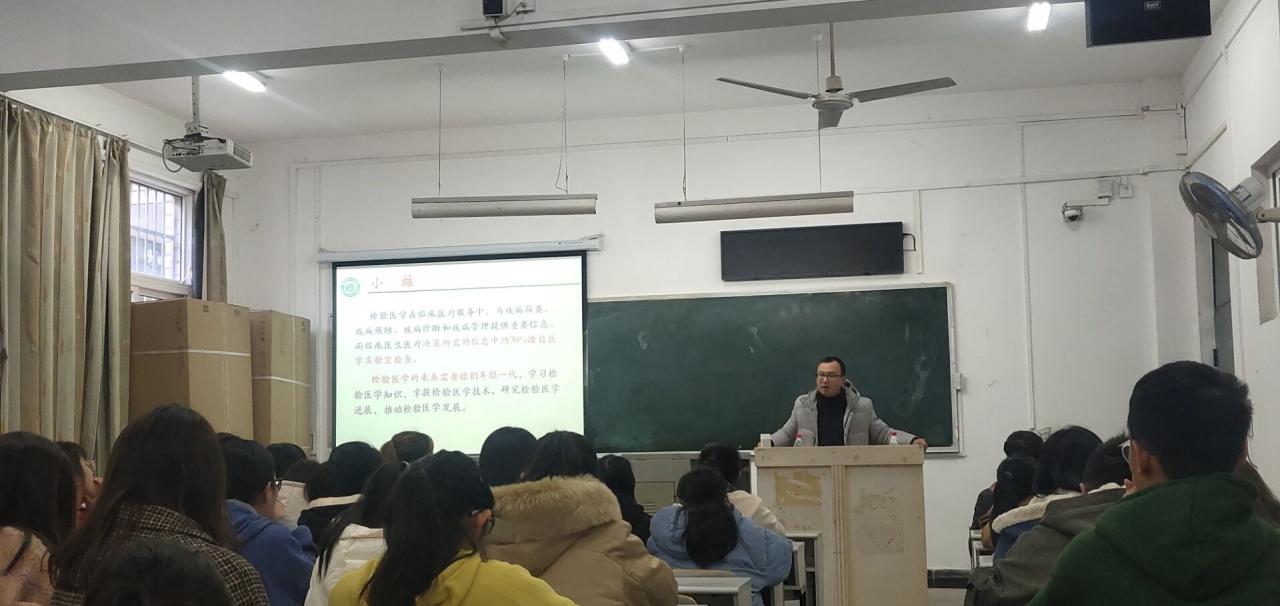 首先,李老师对检验医学的相关概念进行阐述,并指出现阶段的检验医学应该“由重视检验技术向重视检验技术与实验诊断学井重发展”,同时强调作为医者的初心应是“以患者为中心,以疾病诊治为目的”。他呼吁作为医学生应时刻铭记医者的初心。接着,李老师向同学们介绍荆州市中心医院医学检验部,它设置按检验技术分组管理和按病种分组管理两种形式。随后,李老师通过具体病例帮助同学们更好的了解检验医学,同学们纷纷感叹检验医学在治疗过程中起到的重要作用。