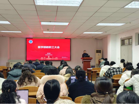 最后,学部党委书记黄群俊传达了学校党委部署开展树立和践行正确政绩观学习教育,新学期工作交流会,2025年度学院工作报告会等会议精神。面对新形势、新任务、新要求,黄书记强调,一要提升格局,拓宽视野,以更高站位谋划发展;二要勇于创新,锐意进取,以更强担当应对挑战;三要团结一心,实干笃行,以更实作风开创未来。会议号召,广大干部师生要以更加饱满的热情、更加务实的作风、更加昂扬的斗志,推动william威廉中文各项事业再上新台阶,为培养优秀医学人才、服务人民健康福祉作出长大贡献。