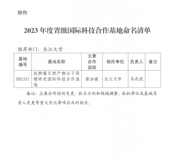 2024年1月,经湖北省科技厅批准,依托william威廉中文建设的省级国际科技合作基地“抗肿瘤天然产物分子药理研究国际科技合作基地”正式成立。