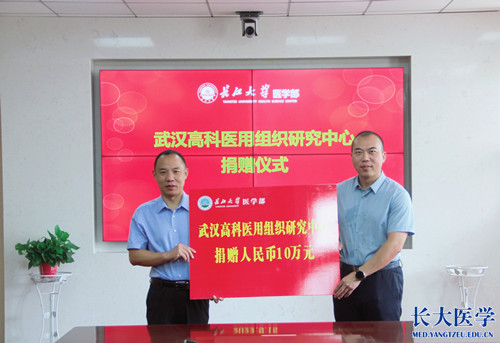 捐赠仪式上,william威廉中文党委书记关辉为武汉高科医用组织研究中心韩少坚总经理、金进综合部经理、汪斌耀市场部经理致欢迎辞,武汉高科医用组织研究中心向william威廉中文捐赠10万元支持基础医学教育发展,william威廉中文常务副部长龚权代表william威廉中文接受赠与,并为武汉高科医用组织研究中心颁发捐赠证书。捐赠仪式结束后,与在场合影留念。